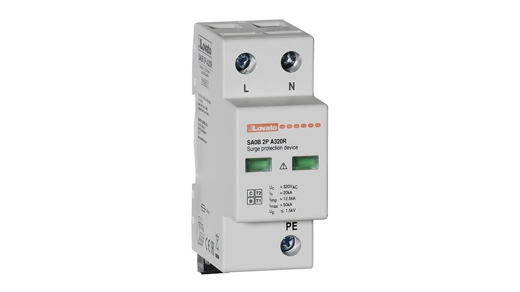 Dispositivo di protezione contro le sovratensioni, monoblocco, tipo 1 e 2, corrente massima di sovraccarico 50kA, monofase, montaggio su guida DIN, indicatore di stato con uscita per indicazione remota, grado di protezione IP20, installabile in aree ad alto rischio di fulmini diretti, serie SA0B, marchio Lovato.