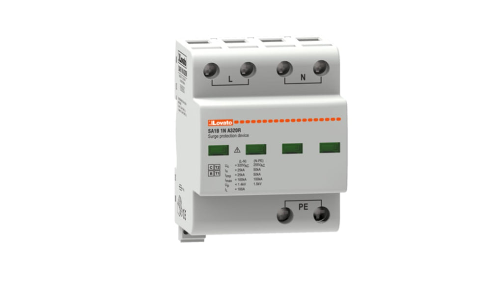 Dispositivo di protezione contro le sovratensioni monoblocco, 1 fase, corrente massima di sovraccarico 100kA, corrente di scarica 25kA, gamma SA1B, serie SA1B1, fissaggio su guida DIN, indicatore di stato frontale, temperatura d'esercizio -40 a 80 gradi Celsius. Marchio Lovato, codice costruttore SA1B1NA320R.