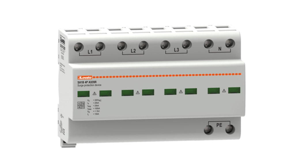 Dispositivo di protezione contro le sovratensioni monoblocco. Corrente massima di sovraccarico 100kA, monofase, montaggio su guida DIN. Grado di protezione IP20. Indicato per installazioni in aree ad alto rischio di fulmini diretti. Versione con uscita per indicazione di stato remota. Serie SA1B. Marchio Lovato. Codice costruttore SA1B4PA320R.