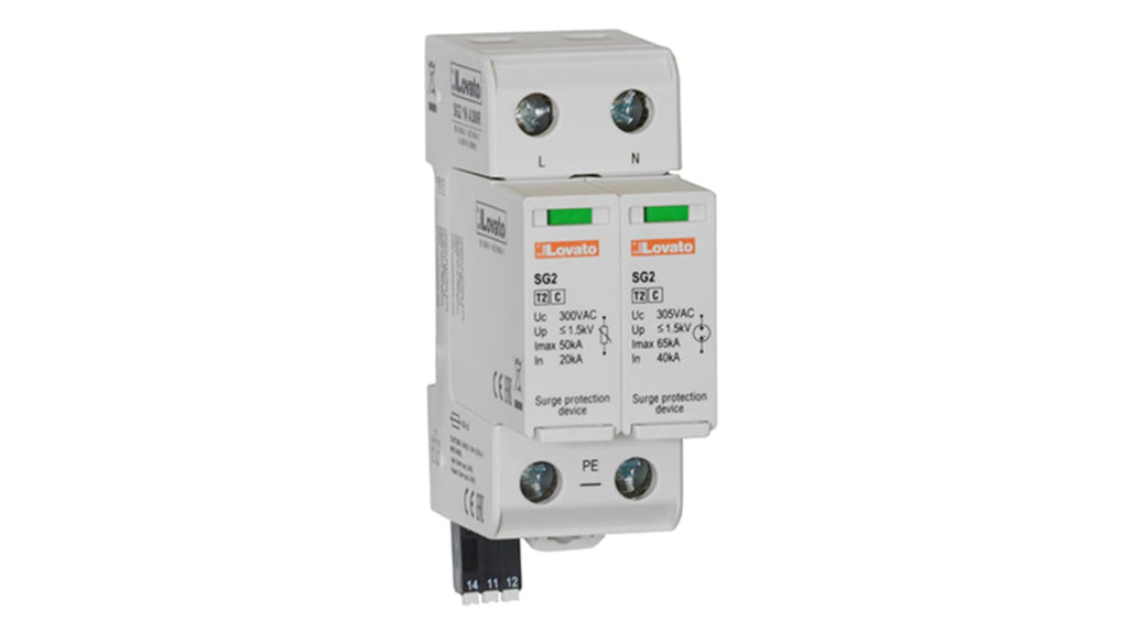 Dispositivo di protezione contro le sovratensioni di tipo 2, 1 fase, corrente di scarica nominale 20kA per polo, corrente massima di sovraccarico 50kA, fissaggio su guida DIN, temperatura d'esercizio da -40 a 85 gradi Celsius, serie SG2, modello SG21.