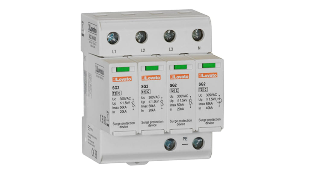 Dispositivo di protezione contro le sovratensioni di tipo 2, tre poli con neutro, corrente di scarica nominale 20kA per polo, corrente massima di sovraccarico 50kA, montaggio su guida DIN, temperatura d'esercizio da -40 a 85 gradi Celsius, serie SG2, gamma SG23.