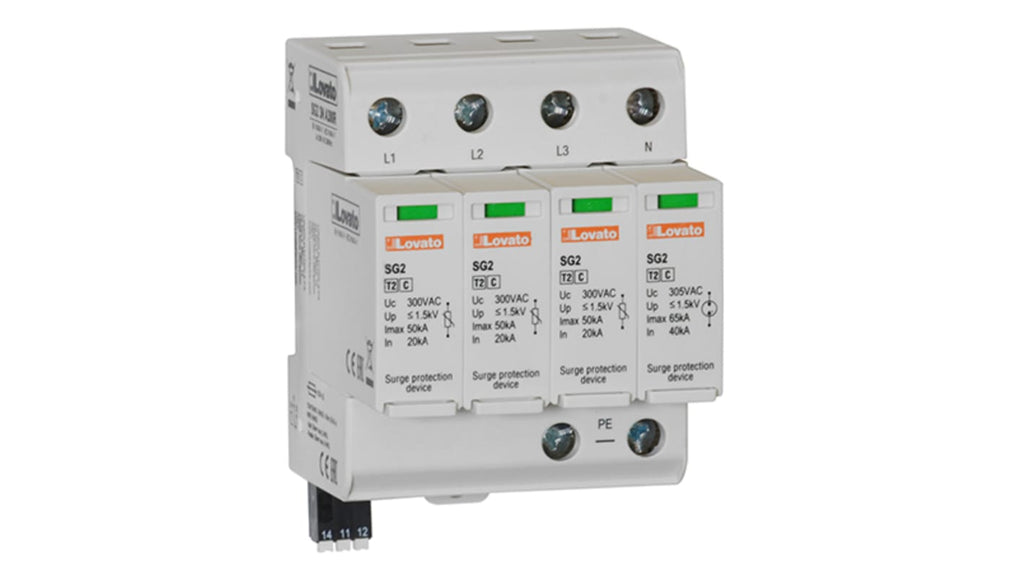 Dispositivo di protezione contro le sovratensioni di tipo 2, tre poli con neutro, corrente di scarica nominale 20kA per polo, contatto remoto, fissaggio su guida DIN, temperatura d'esercizio da -40 a 85 gradi Celsius, serie SG2, gamma SG23.