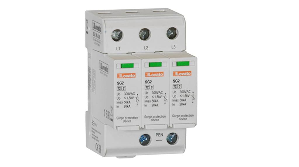 Dispositivo di protezione contro le sovratensioni di tipo 2, tre poli, corrente di scarica nominale 20kA per polo, corrente massima di sovraccarico 50kA, gamma SG2, serie SG23, temperatura d'esercizio da -40 a 85 gradi Celsius, montaggio su guida DIN. Codice costruttore SG23PA300, marchio Lovato.