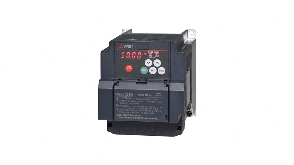 Inverter a frequenza Mitsubishi Electric, potenza nominale 2,5 kW, tensione di alimentazione 200-240 V CA, fase 1, corrente nominale 7 A, frequenza di uscita 120 Hz, serie FR-CS80, grado di protezione IP20, controllo vettoriale del flusso, design compatto, adatto per motori a induzione e applicazioni industriali.