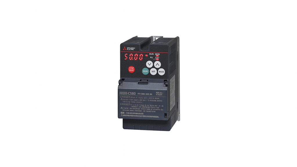 Inverter trifase Mitsubishi Electric, potenza nominale 0,75 kW, tensione di alimentazione 380-480 V CA, corrente nominale 2,2 A, frequenza di uscita 120 Hz, grado di protezione IP20, serie FR-CS80. Design compatto, controllo vettoriale del flusso, adatto per motori a induzione e applicazioni industriali.