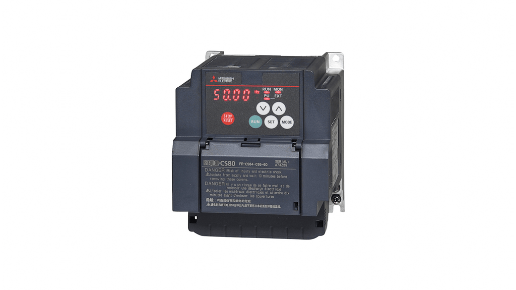 Inverter trifase Mitsubishi Electric, potenza nominale 1,5 kW, tensione di alimentazione 380 a 480 V CA, corrente nominale 3,6 A, frequenza di uscita 120 Hz, grado di protezione IP20, serie FR-CS80. Controllo vettoriale del flusso, design compatto, adatto per applicazioni industriali.