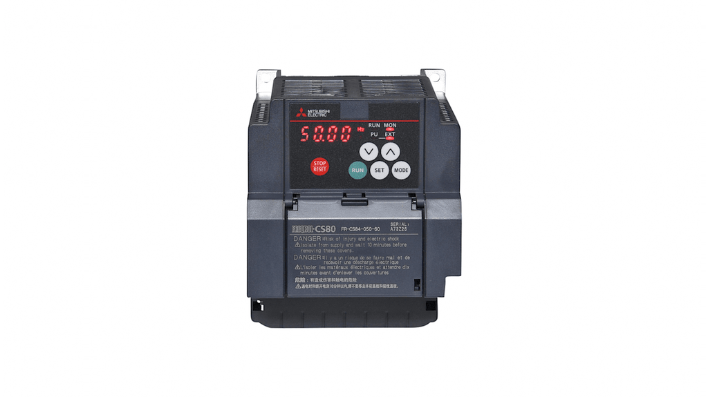Inverter trifase Mitsubishi Electric, potenza nominale 2,2 kW, tensione di alimentazione 380-480 V CA, corrente nominale 5 A, frequenza di uscita 120 Hz, grado di protezione IP20, serie FR-CS80. Design compatto, controllo vettoriale del flusso, adatto per motori a induzione, soluzione economica per applicazioni industriali.