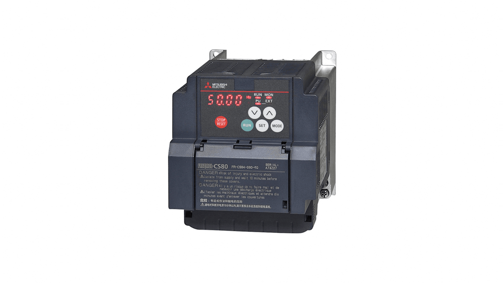 Inverter trifase Mitsubishi Electric, potenza nominale 3,7 kW, tensione di alimentazione 380 a 480 V CA, corrente nominale 8 A, frequenza di uscita 120 Hz, grado di protezione IP20, serie FR-CS80. Design compatto, controllo vettoriale del flusso, adatto per applicazioni industriali.