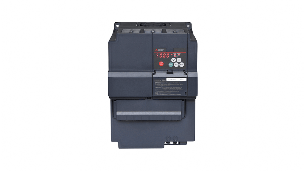 Inverter trifase Mitsubishi Electric, potenza nominale 11 kW, tensione di alimentazione 380 a 480 V CA, corrente nominale 23 A, frequenza di uscita 120 Hz, grado di protezione IP20, serie FR-CS80. Design compatto, controllo vettoriale del flusso, adatto per applicazioni industriali, utilizzo in motori a induzione.