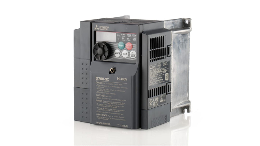 Inverter trifase Mitsubishi Electric, potenza nominale 0,75 kW, tensione di alimentazione 400 V c.a., frequenza di uscita 0.2 a 400 Hz, corrente nominale 2,2 A, interfaccia seriale ModBus, grado di protezione IP20, lunghezza 128 mm, profondità 129.5 mm, larghezza 108 mm, conforme a CE, UL, cUL, GOST, RoHS, dotato di controllo vettoriale senza sensore e riavvio automatico dopo interruzioni di alimentazione.