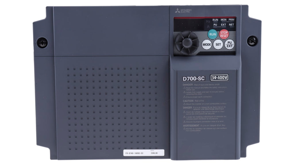 Inverter trifase Mitsubishi Electric, potenza nominale 7,5 kW, tensione di alimentazione 400 V c.a., frequenza di uscita 0.2 a 400 Hz, corrente nominale 16 A, interfaccia seriale ModBus, grado di protezione IP20, lunghezza 150 mm, larghezza 220 mm, profondità 155 mm, conforme a CE, UL, cUL, GOST, RoHS, dotato di controllo vettoriale senza sensore e riavvio automatico dopo interruzioni di alimentazione.