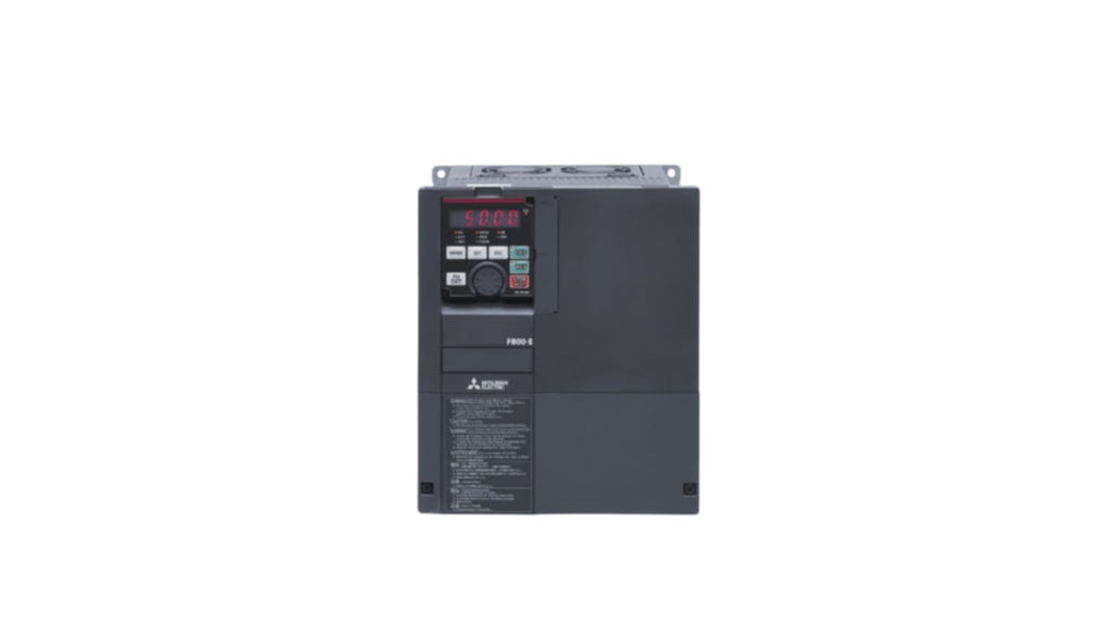 Inverter per controllo VFD, potenza nominale 7,5 kW, tensione 400 V c.a., 3 fasi, frequenza 50/60Hz, corrente nominale 17 A, montaggio a parete, grado di protezione IP20, interfaccia Ethernet, comunicazione BACnet, controllo PID, filtro incluso, pannello di controllo, dimensioni 220mm x 260mm x 170mm, serie FR-F800, funzione Anti-Windmill, orologio in tempo reale, rilevamento del carico.