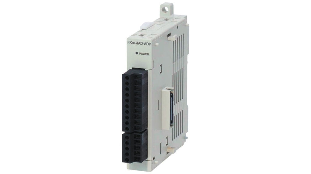 Modulo di ingresso analogico per PLC Mitsubishi Electric, compatibile con la Serie MELSEC FX, dotato di 4 ingressi analogici per tensione (0V a 10V) e corrente (4mA a 20mA), risoluzione da 15 a 16 bit, temperatura operativa da 0 °C a 55 °C, dimensioni 90 x 55 x 87 mm, montaggio sul lato sinistro delle unità base PLC, certificazioni CE e UL/cUL.