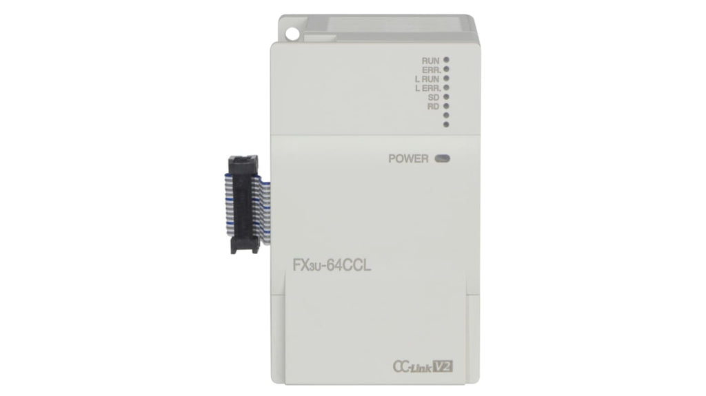 Modulo di comunicazione per PLC Mitsubishi Electric, serie FX3U, compatibile con PLC iQ FX3 e FX3U. Tipo accessori: modulo di comunicazione, applicazione: rete industriale, tipo di montaggio: guida DIN, dimensioni: 55 x 90 x 87 mm. Abilita funzionalità V2 CC-Link per trasmissione ciclica espansa e programmazione tramite CC-Link. Codice costruttore: FX3U-64CCL.