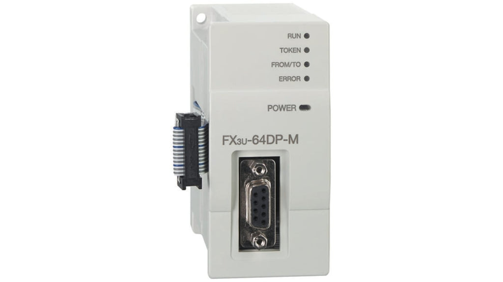 Modulo I/O PLC per serie FX3U. Modulo master Profibus FX3U-64DP-M, compatibile con unità FX3U, occupa 8 punti I/O. Interfaccia Profibus/DP con connettore D-Sub a 9 pin, TCP/IP e UDP con connettore RJ45. Dimensioni 90 x 43 x 87 mm. Alimentazione prelevata dall'unità base PLC. Supporta comunicazione peer-to-peer con altri PLC serie FX3U e Q.