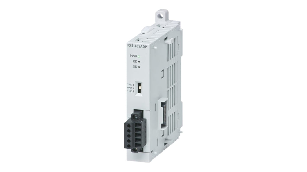 Modulo di comunicazione Mitsubishi Electric, serie FX5, per FX5U e FX5UC. Adattatore di espansione comunicazione, montaggio a pannello, tipo ingresso corrente e tensione, dimensioni 17,6 x 106 x 74 mm, max 2 adattatori per CPU. Compatibile con versioni RS-232 e RS-485. Progettato per comunicazione e flessibilità in applicazioni industriali.