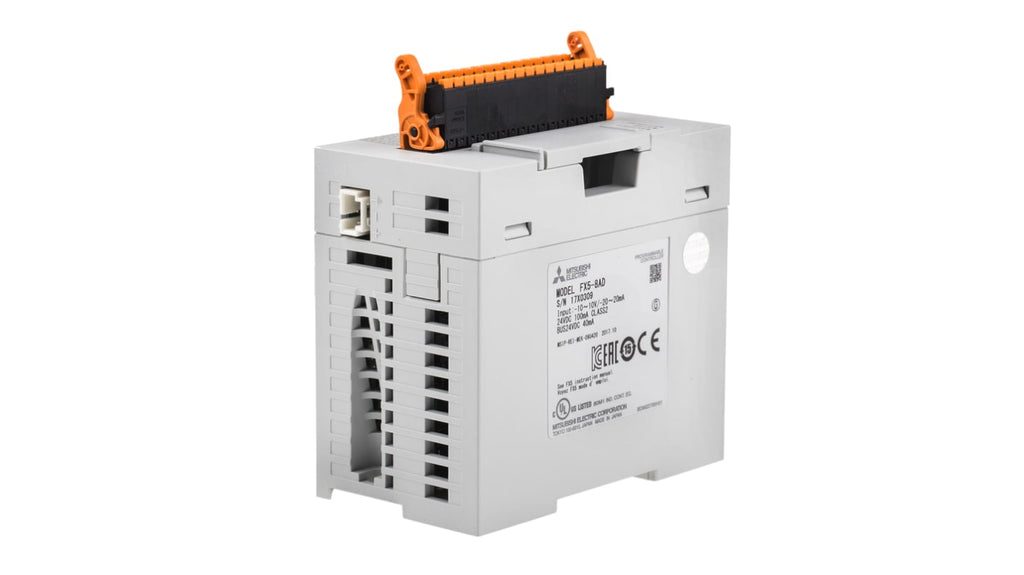 Modulo di ingresso analogico per applicazioni industriali, Mitsubishi FX5-8AD, 8 ingressi analogici, ingresso di tensione, ingresso di corrente, termocoppia, rilevatore di temperatura a resistenza, uscita digitale, alimentazione 24 V c.c., corrente di uscita 100 mA, montaggio su guida DIN, temperatura operativa massima 1600 °C, dimensioni 50 x 102,2 x 90 mm, compatibile con moduli CPU FX5U e FX5UC.