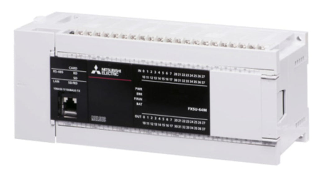 CPU PLC Mitsubishi Electric iQ-F MELSEC, 32 ingressi e 32 uscite, tensione 5 V c.c. e 24 V c.c., dimensioni 220 x 90 x 83 mm, montaggio desktop, porta Ethernet e RS485, memoria 120 kB, capacità programma 128 kB, slot per scheda SD, operatività da -20 a +55 gradi Celsius, linguaggio di programmazione FBD/LD, display incluso. Codice costruttore FX5U-64MR/DS.