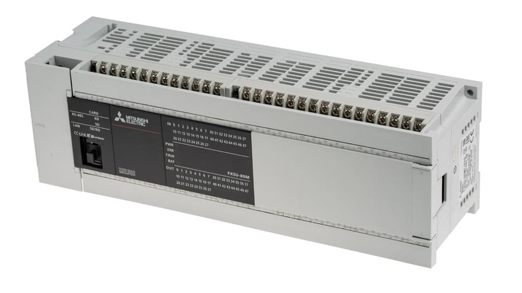 Unità di base CPU per PLC Mitsubishi Electric FX5U, 40 ingressi, 40 uscite, 80 I/O, tensione 100-240 V c.a., montaggio a pannello, dimensioni 285 x 90 x 83 mm, temperatura operativa da 0 a 55 gradi Celsius, porta Ethernet e RS485, memoria 120 kB, capacità programma 64 k passi, certificazione CE e cULus. Compatibile con MELSEC IQ-F, supporta vari protocolli di comunicazione.