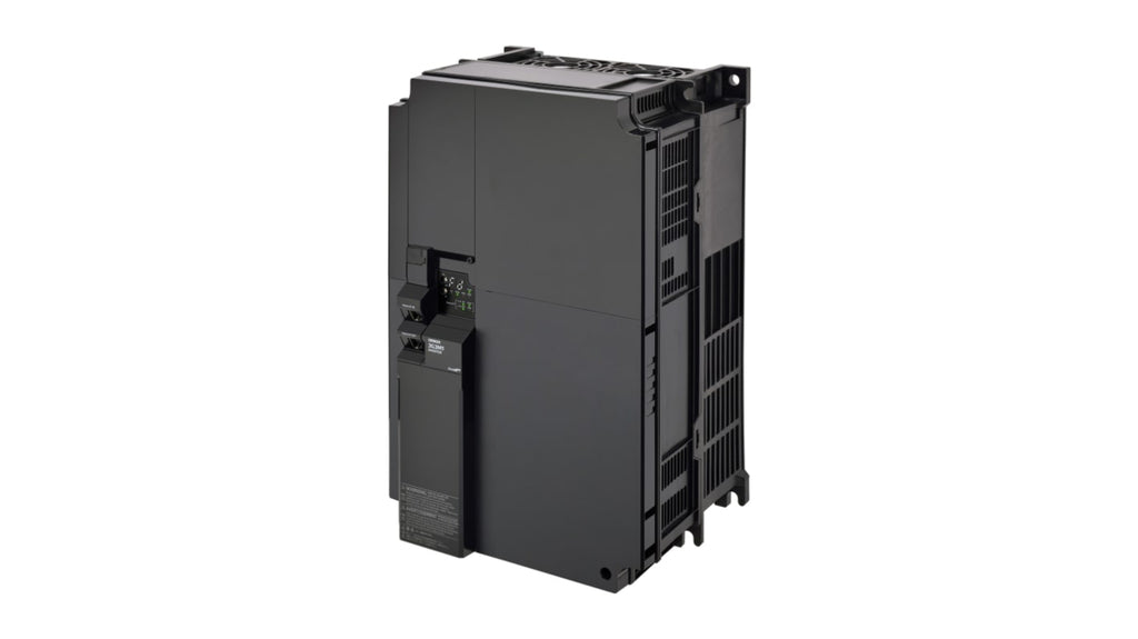 Avviatore a velocità variabile Omron, potenza nominale 0.4 a 22 kW, tensione di alimentazione 400 V CA, 3 fasi, corrente nominale 60 A. Controllo di coppia per IM in OLV/CLV, PM in CLV, encoder incorporato, ingresso contatore di impulsi, supporto Modbus RS-485, porta di programmazione USB. Certificato CE, UKCA, cULus, KC, conforme RoHS e RCM. Serie M1. PCB rivestito per resistenza a polvere e umidità.