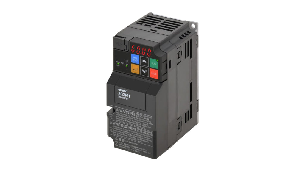 Avviatore a velocità variabile Omron, potenza nominale 0,2 a 3,7 kW, tensione di alimentazione 200 V CA, fase 1, corrente nominale 1,9 A. Controllo di coppia per IM in OLV/CLV, PM in CLV, encoder incorporato, ingresso contatore di impulsi, supporto Modbus RS-485, porta di programmazione USB. Certificato CE, UKCA, cULus, KC, conforme RoHS e RCM. PCB rivestito per resistenza alla polvere e umidità.