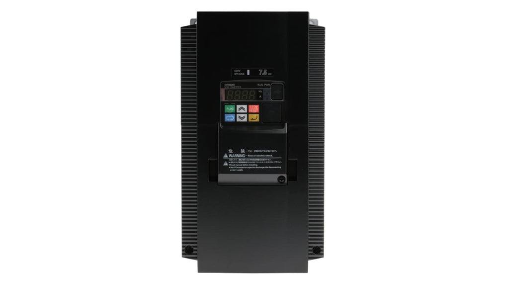 Inverter trifase Omron, potenza nominale 7,5 kW, tensione 400 V c.a., corrente nominale 18,0 A, frequenza di uscita 400 Hz, grado di protezione IP20, comunicazione field bus Profibus, dimensioni 260 mm x 140 mm x 155 mm, con pannello di controllo e funzionalità STO. Progettato per motori in c.a., offre controllo avanzato e personalizzabile.