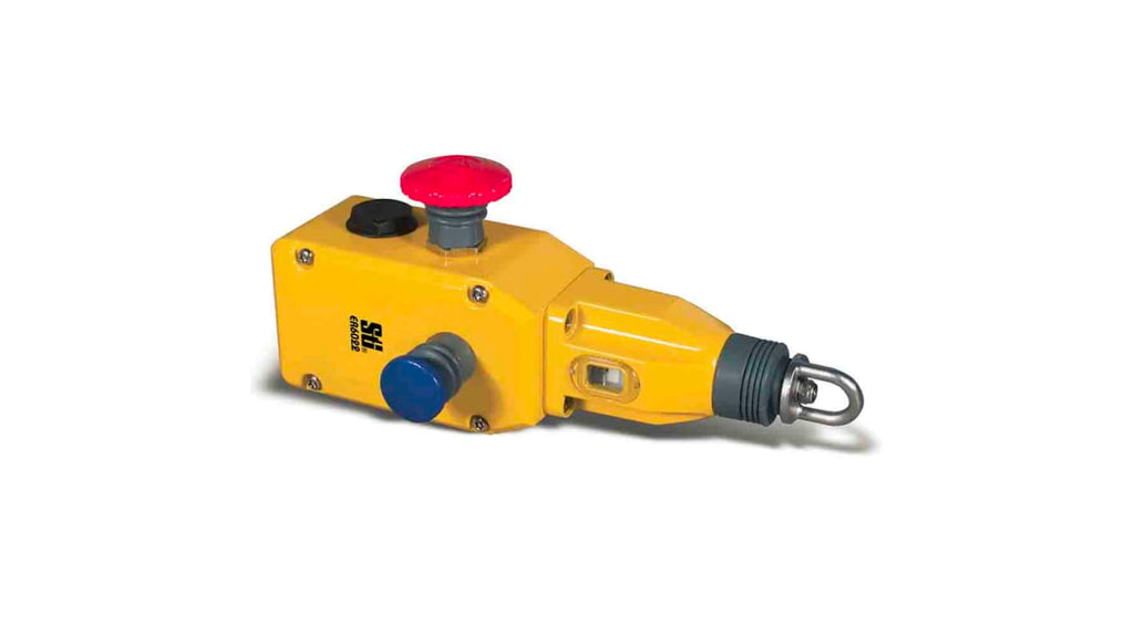 Interruttore di arresto di emergenza a fune di sicurezza, 2 contatti N/C e 1 contatto N/A, segnalatore luminoso incluso, tensione 24 V c.c., cavo da 80 m, protezione IP 67, dimensioni 63 x 86 x 222 mm, corrente massima 3 A, temperatura operativa da -25 a +80 gradi, ingresso cablaggio M20 x 3, conforme a CE, cUL, UL.