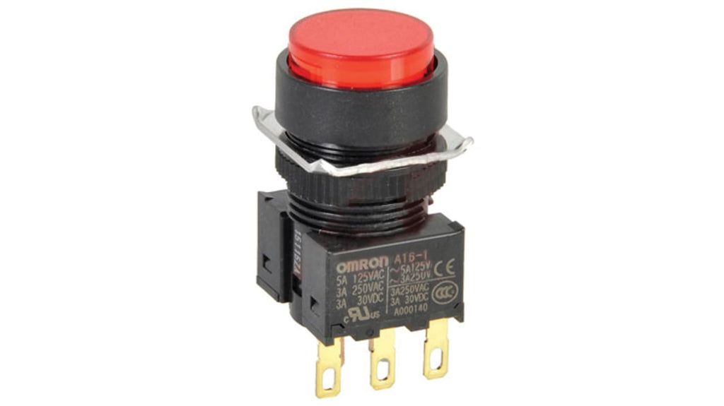 Pulsante Omron SPDT, montaggio a pannello, diametro foratura 16 mm, protezione IP40, materiale in policarbonato, temperatura operativa da -10 a +55 gradi Celsius, tensione massima 250 V c.a., 30 V c.c., conforme a EN 60947-5-1, struttura modulare, unità interruttore scollegabile, facilità di cablaggio. Codice costruttore A16-TRM-1, colore rosso.