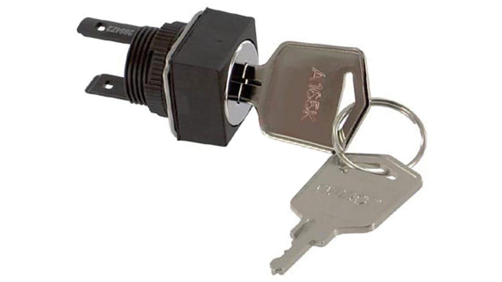 Interruttore a chiave a 2 posizioni, DPDT, tenuta IP65, diametro foratura 16 mm, tensione nominale 230 V c.a., operazioni a ritenuta, struttura miniaturizzata, contatti per carichi standard e microcarichi, disposizione terminali per facile cablaggio, unità scollegabile, temperatura operativa da -10 a +55 gradi Celsius, conforme a EN 60947-5-1.