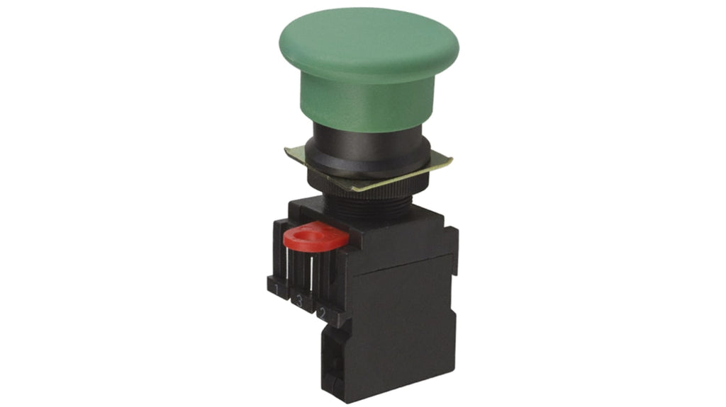 Pulsante Omron SPST, montaggio a pannello, diametro foratura 22 mm, colore verde, materiale policarbonato, grado di protezione IP65, temperatura operativa da -20 a 70 gradi Celsius, durata meccanica 5.000.000 operazioni, durata elettrica 500.000 operazioni, tensione massima c.a. 440V, tensione massima c.c. 380V, conforme a standard UL, cUL, EN60947-5-1, CCC. Codice costruttore A22-MG-10M.