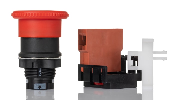 Pulsante di arresto di emergenza Omron A22E, montaggio a pannello, diametro foro 22 mm, attuazione a pulsante, rilascio a rotazione, configurazione contatto 1NC, non illuminato, grado di protezione IP65, colore rosso, materiale plastica, diametro pulsante 40 mm, operazioni ruotare per ripristinare, conforme a UL508, C22.2 No.14, EN60947-5-1, EN60947-5-5.