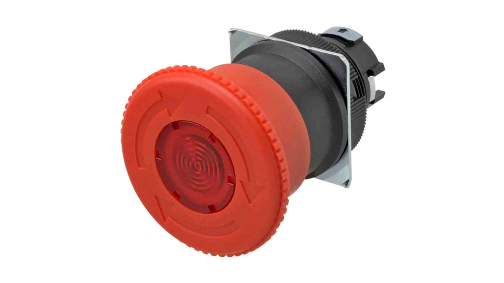 Pulsante di arresto di emergenza montaggio a pannello, diametro foro 22mm, attuazione a pulsante, rilascio a rotazione, illuminato. Grado di protezione IP65, funzione di reset all'accensione. Prodotto della gamma A22NE, codice costruttore A22NE-M-L, marchio Omron.
