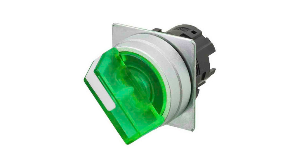 Unità di azionamento per selettori Omron, illuminato, colore verde trasparente, 2 posizioni, diametro foro 22mm, realizzato in metallo spazzolato, compatibile con modelli della gamma A22N.