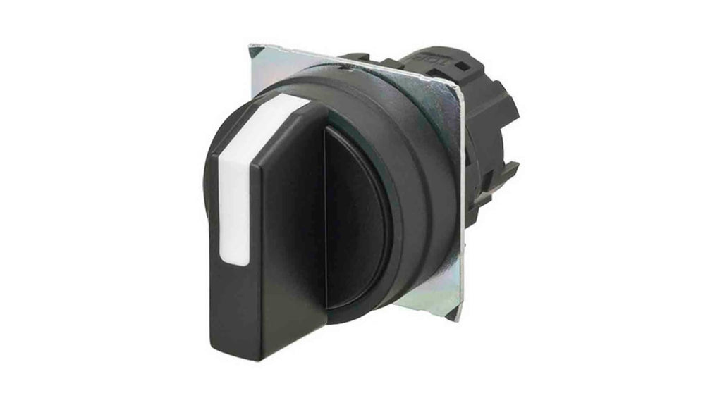 Unità di azionamento per selettore Omron, non illuminata, colore nero opaco, design compatto. Numero di posizioni: 3, diametro foro: 22mm, serie A22NS. Utilizzabile con modelli della gamma A22N, non disponibile come interruttore assemblato.
