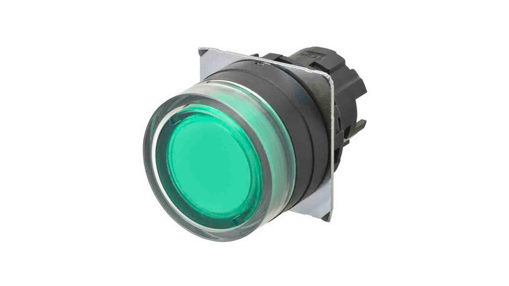 Interruttore a pulsante Omron, funzionamento momentaneo, illuminato, grado di protezione IP66, diametro 22 mm, lunetta verde trasparente, lampada LED verde a 24 V CC, materiale corpo in plastica, temperatura operativa da -25 a +55 gradi Celsius. Adatto per pannelli di controllo e macchinari industriali. Lampade LED intercambiabili disponibili. Codice produttore A22NZ-BGM-TGA.