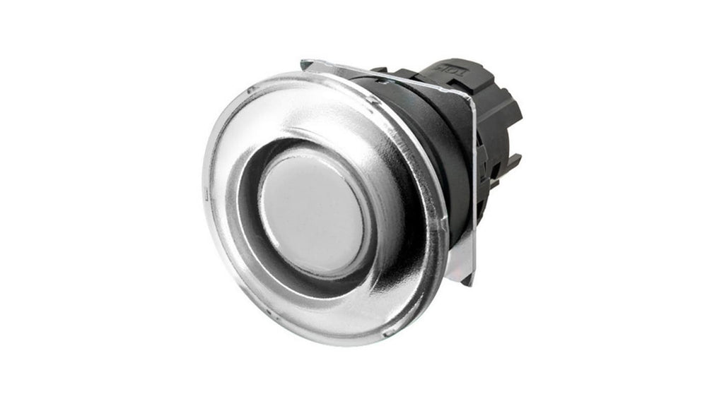 Attuatore pulsante tipo Instabile, testa a fungo, Omron serie A22N, diametro foro 22mm, colore bianco, cornice in plastica, cappuccio bianco trasparente, design compatto, miglioramenti della sicurezza.