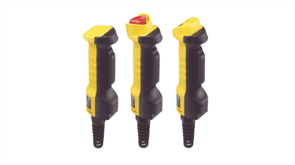Interruttore di abilitazione di sicurezza a 3 posizioni. Montaggio in due direzioni, conformità CE, progettato per migliorare la sicurezza nelle operazioni robotiche. Conformità agli standard ANSI/RIA R15.06-1999. Serie A4E. Marchio Omron. Codice costruttore A4E-B200HS.