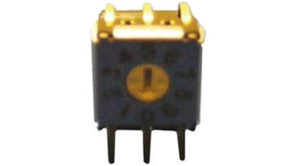 Interruttore DIP rotante miniaturizzato, 16 posizioni, attuatore a leva rotativa, montaggio con foro passante, dimensioni 7,2 x 7,2 mm, distanza pin 2,54 mm, ingombro 5,08 mm, corrente nominale 25 mA a 24 V cc, contatti placcati oro, durata meccanica 20000 operazioni, temperatura operativa da -30 a +80 gradi Celsius, rigidità dielettrica 250 V ca.