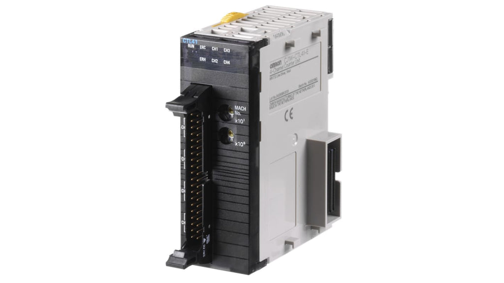Regolatore logico per sistemi PLC. Marchio Omron, modello CJ1W-CTL41-E, 4 ingressi, configurabile liberamente. Temperatura d'esercizio da 0 a 55 gradi Celsius, temperatura di stoccaggio da -20 a 70 gradi Celsius, umidità dal 10% al 90% senza condensa. Assorbimento di corrente interno 320 mA a 5 V. Tipo di ingresso: encoder incrementale, driver di linea RS-422, Open Collector.