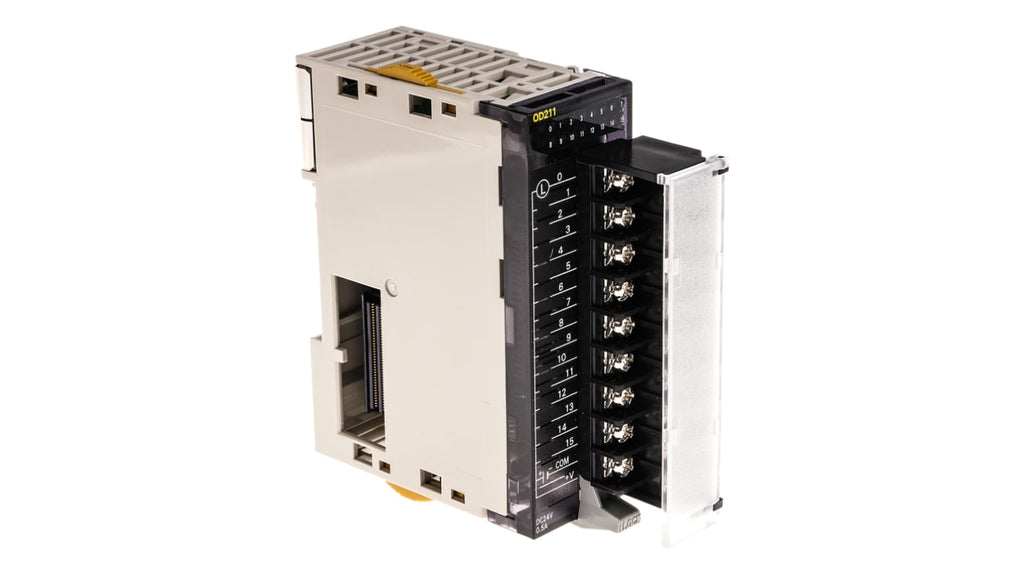 Modulo I/O PLC per la serie SYSMAC CJ, 16 uscite digitali a transistor PNP, protezione cortocircuito e rilevamento rottura cavo, corrente di uscita 500 mA, dimensioni 89 x 31 x 95,4 mm, morsettiere a vite rimovibili, compatibile con moduli CJ1M fino a 10 unità.