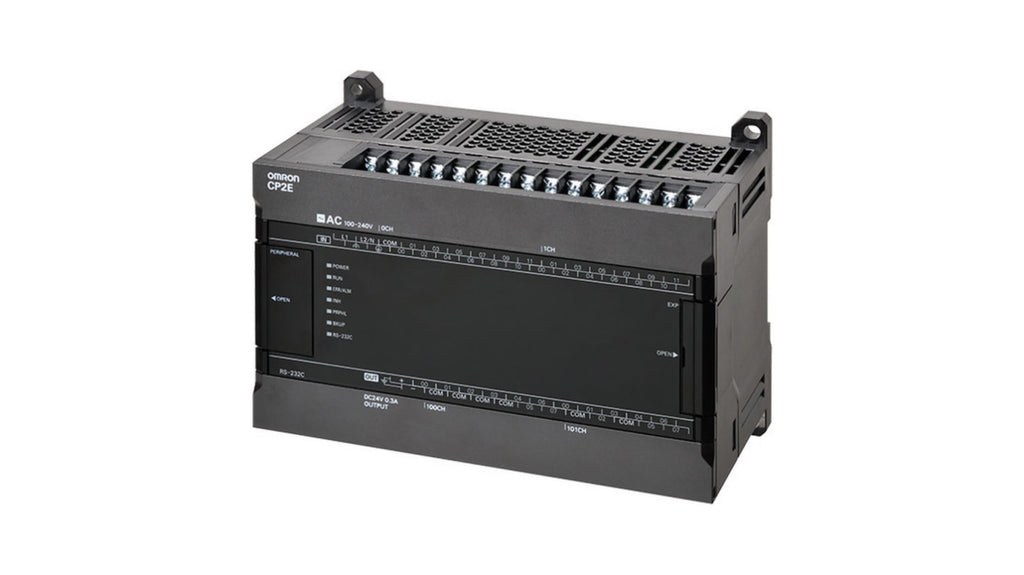 CPU PLC compatto serie CP2E, 24 ingressi digitali, 16 uscite relè, alimentazione 100-240 V c.a., memoria programma 4 kB, due porte Ethernet, fino a tre porte seriali, funzionamento senza batteria, temperatura operativa da -20 a 60 gradi Celsius, dimensioni 150 x 80 x 110 mm, montaggio a pannello, indicatori LED per risoluzione problemi. Codice costruttore CP2E-E40DR-A, marchio Omron.