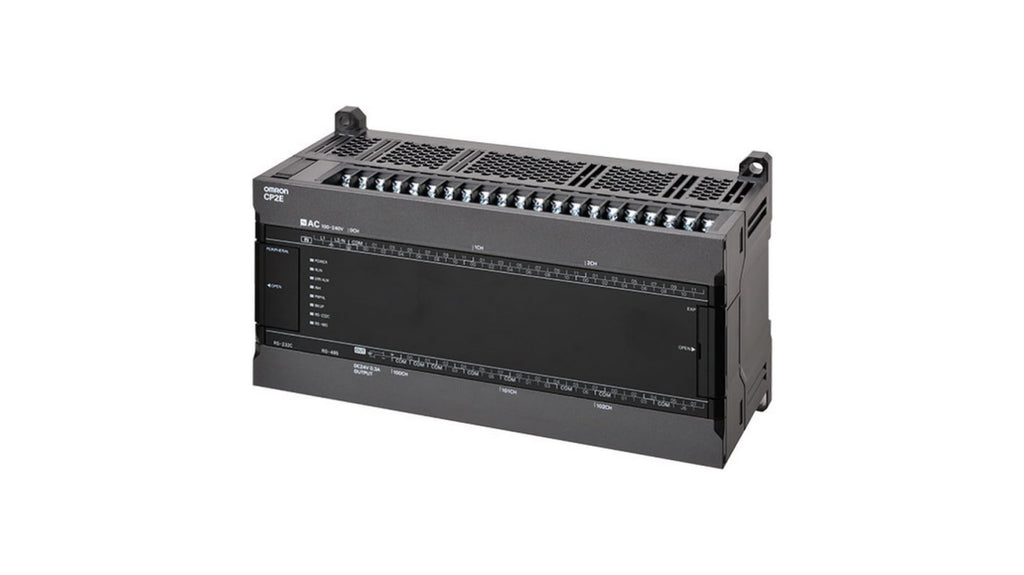 CPU PLC compatto Omron serie CP2E, 36 ingressi digitali, 24 uscite transistor, alimentazione 24 V c.c., memoria programma 10 kB, due porte Ethernet, fino a tre porte seriali, funzione di posizionamento a quattro assi, temperatura operativa da -20 a 60 gradi Celsius, dimensioni 195 x 80 x 110 mm, montaggio a pannello, linguaggio di programmazione diagramma ladder, batteria di backup inclusa.