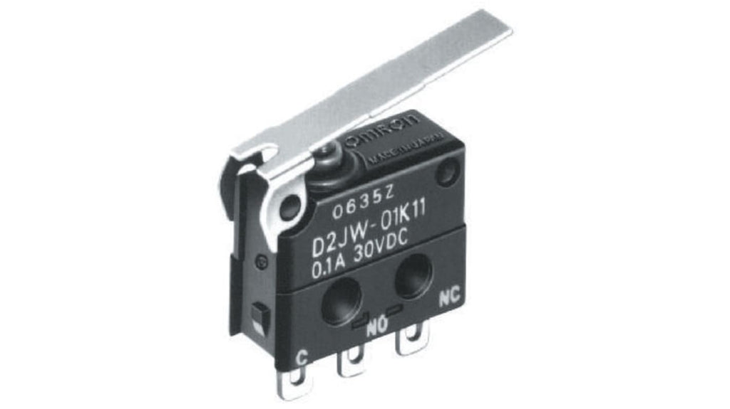 Microinterruttore pre-cablato, Omron, SPDT, 100 mA a 30 V cc, protezione IP67, attuatore a leva a rullo, forza di azionamento 0,98 N, temperatura operativa da -40 a +85 gradi C, contatti in lega d'oro, durata meccanica 1.000.000 operazioni, conforme RoHS, autorizzato UL, CSA, VDE, TUV. Codice costruttore D2JW-01K21-MD.