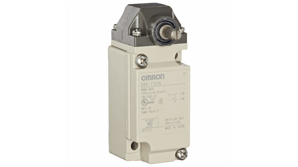Interruttore a doppia interruzione SPDT. Modello D4A-1101N, marchio Omron. Costruzione robusta con doppia guarnizione sulla testa e coperchio di guarnizione completo per miglior tenuta. Disponibile in modelli con gomma fluorurata per resistenza chimica. Include accessori. Adatto per operazioni complesse.