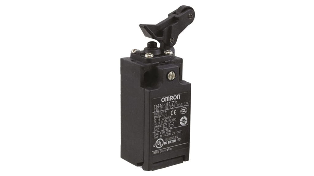 Interruttore di fine corsa di sicurezza miniaturizzato, serie D4N, leva a rullo, configurazione DPST, stato normale NO/NC, tipo di connessione M20, doppio isolamento, contatti standardizzati in struttura aurea, durata meccanica 15000000 cicli, dimensioni 64mm x 31mm x 31.5mm, conforme a EN115 e EN81-1, senza piombo, cadmio o cromo esavalente.