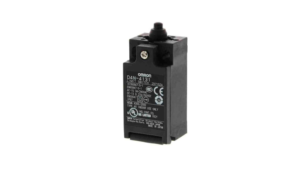Interruttore di fine corsa a scatto Omron D4N, attuatore a pistone, configurazione contatti 2NC, protezione IP67, classe II, temperatura operativa da -30 a 70 gradi Celsius, umidità massima 95%, tubo protettivo M20, contatti placcati oro per alta affidabilità, azione rapida.
