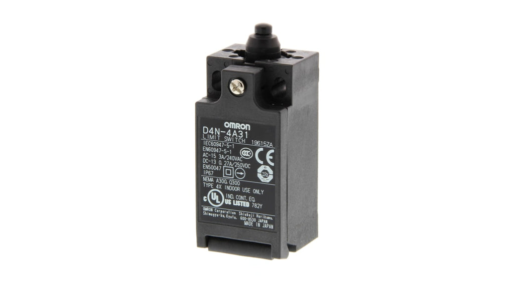 Interruttore di fine corsa Omron, attuatore a stantuffo, configurazione 1NC/1NA, grado di protezione IP67, custodia in plastica, serie D4N, compatibile con carichi standard e microcarichi, modelli con connettore M12 disponibili, certificazioni UL, EN e CCC.