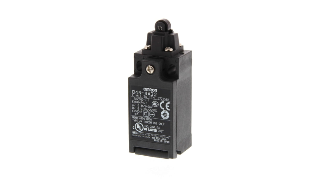 Interruttore di fine corsa di sicurezza, grado di protezione IP67, modello D4N-4A32, marchio Omron. Contatti disponibili: 2NC/1NA, 3NC, 1NC/1NA, 2NC, con opzione MBB per requisiti avanzati. Connettore M12 per semplificare manutenzione, contatti placcati oro per alta affidabilità. Prodotto senza piombo, cadmio e cromo esavalente.