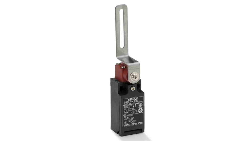 Interruttore di fine corsa Omron, attuatore a leva, configurazione 1NC/1NA, protezione IP67, corrente massima 10A, tensione massima 240V, custodia in metallo, senza piombo, cadmio o cromo esavalente. Modello D4NH-4ABC, progettato per applicazioni industriali.