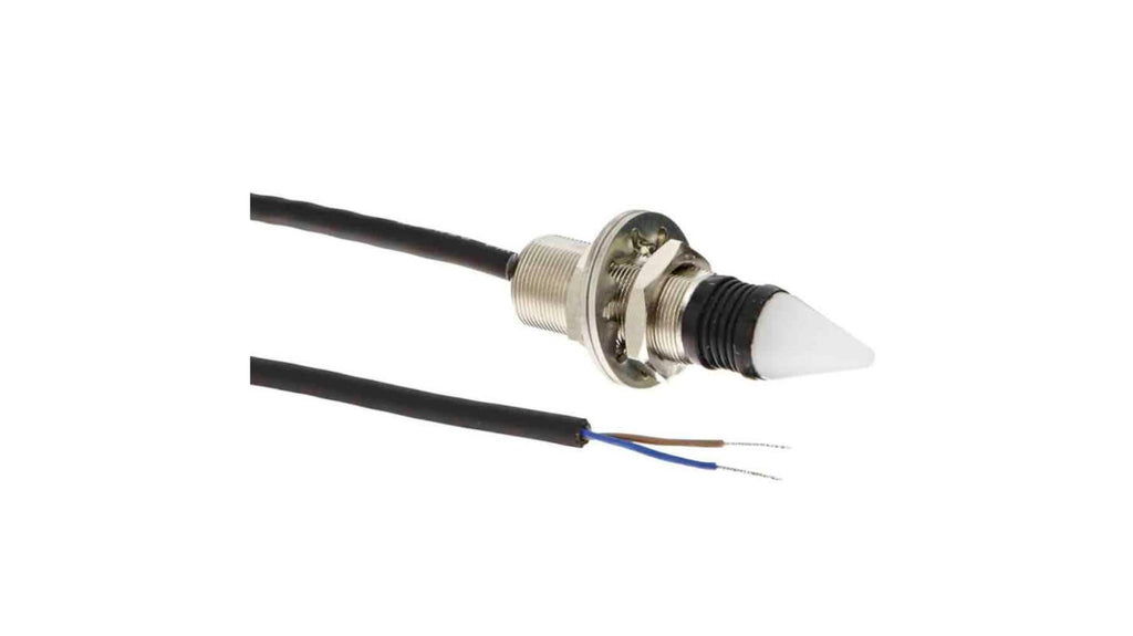 Interruttore capacitivo NC, IP67. Funzione interruttore, attuatore a forma di cono, rilevamento contatto da più direzioni, operatività con leggera forza. Estremamente resistente a polvere e schizzi d'acqua o olio, conforme a IP67. Marchio Omron, codice costruttore D5B-1023.